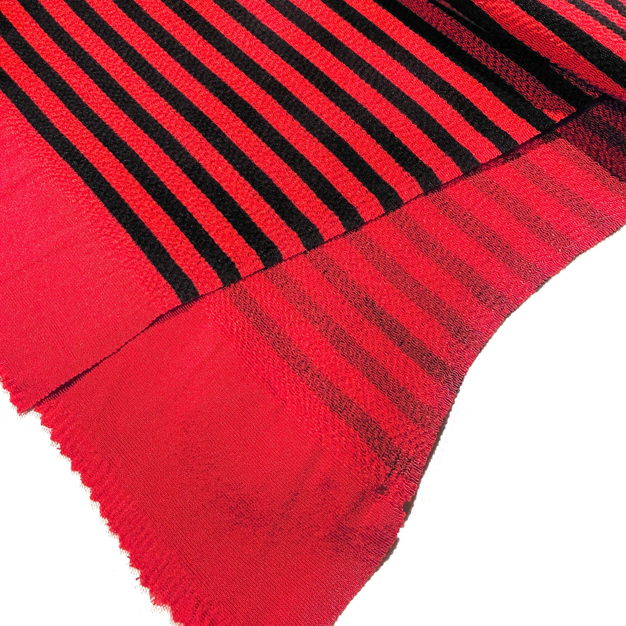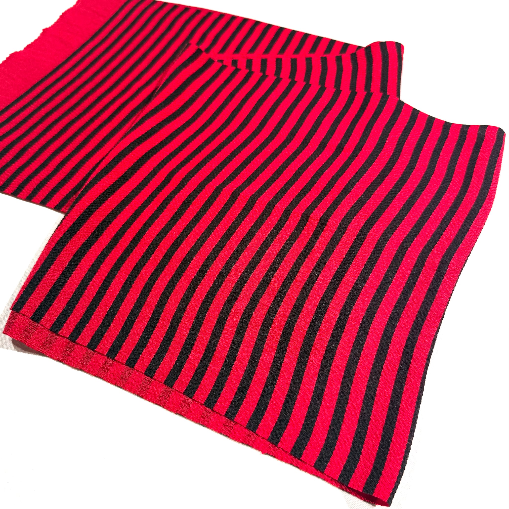 赤地に黒のストライプを配した帯揚げです。赤と黒のコントラストが、帯まわりの装いにシャープな表情とメリハリを生み、印象的に見せます。裏面は赤無地としても使え、コーディネートの幅が広がる一本です。