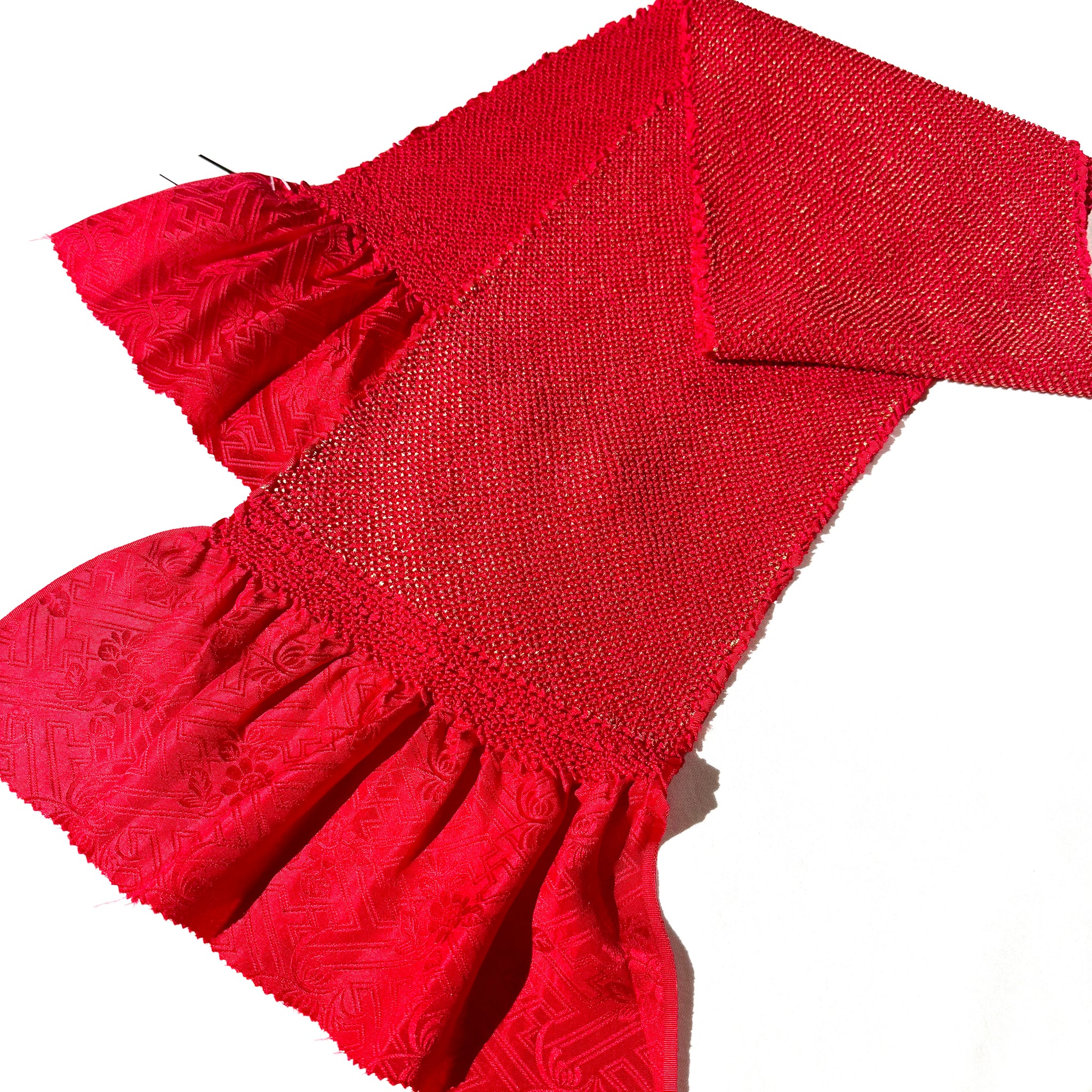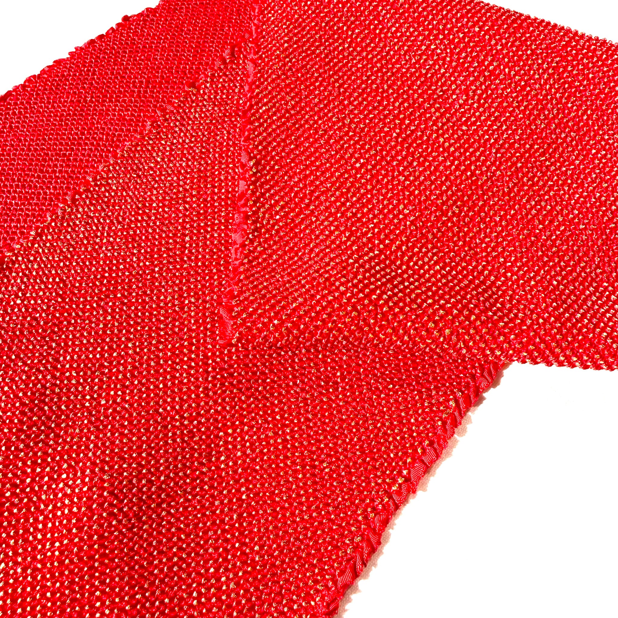 赤の絞り地に金箔を散らした帯揚げです。金の輝きが赤の色合いをいっそう引き立て、 密なシボが生む陰影が、帯まわりの装いにさらに華やかさをもたらす一枚です。